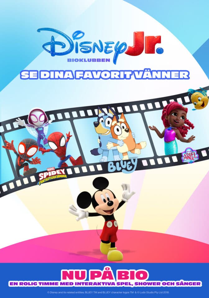 Ta med barnen på Disneys egna knattebiopaket. Möt Spindelmannen, Ariel, Bluey och Superkattungarna. Musse Pigg guidar barnen igenom alla avsnitten blandat med interaktiva inslag som lekar, sång och dans.