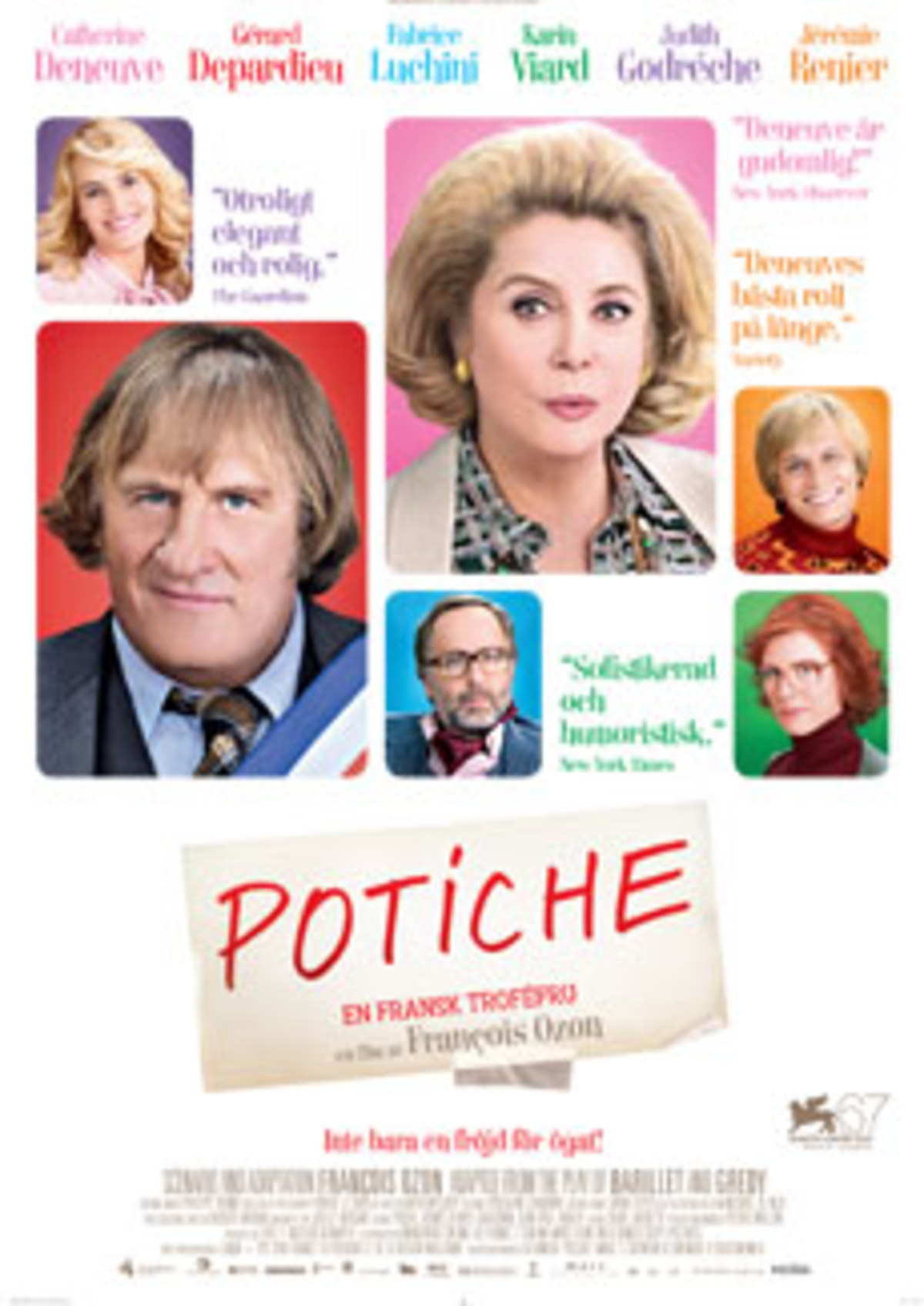 Franska regissören François Ozon gör återigen ett färgstarkt kvinnoporträtt där eviga skönheten Catherine Deneuve gör en hunsad hemmafru på 70-talet som av en slump blir tillfällig chef på makens fabrik – och gör succé! Det är charmigt, roligt och snyggt om än en aning simpelt.
