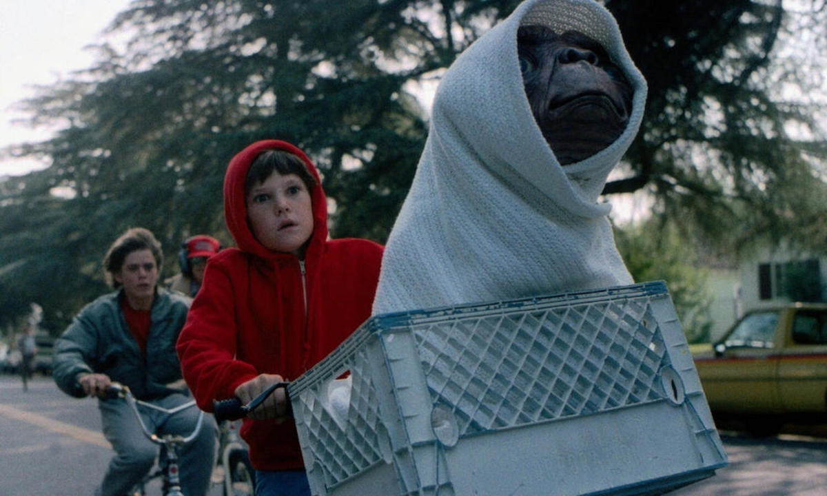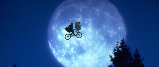 En av filmskaparens mest älskade filmer och en barndomsfavorit för många är klassikern om den charmiga titelutomjordingen som blir en älskad familjemedlem hemma hos unga Elliot (Henry Thomas). Filmens kanske häftigaste scen är en jakt där det ser ut som om Elliot och hans vänner är på väg att fångas av polisen men ser sina cyklar burna upp i luften av E.T.:s magiska krafter så pass att de passerar månen! Aldrig har den barnsliga viljan att flyga eller sväva känts så levande. Bilden är så ikonisk att Spielberg använde den som logga för sitt produktionsbolag Amblin.