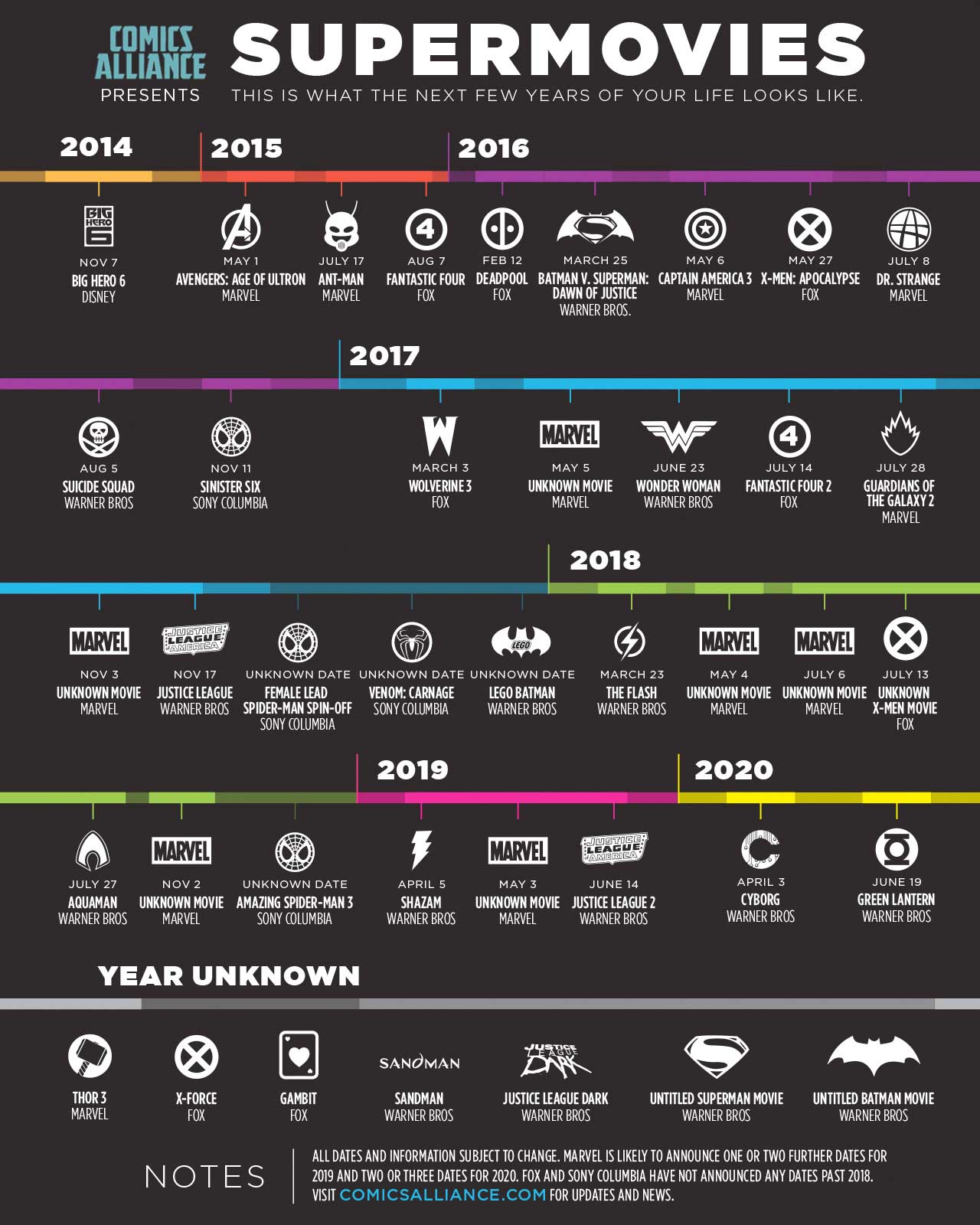 Att de närmsta åren kommer att vara späckad med superhjältefilmer har vi insett. Härom veckan släppte Warner Bros schemat med kommande filmatiseringar av sina DC Comics-karaktärer och nu är det tufft att hålla kolla på alla releasedatum. Comics Alliance tog sitt ansvar och tog fram ett schema med alla superhjältefilmer och datum, som du kan kolla in här nedan.