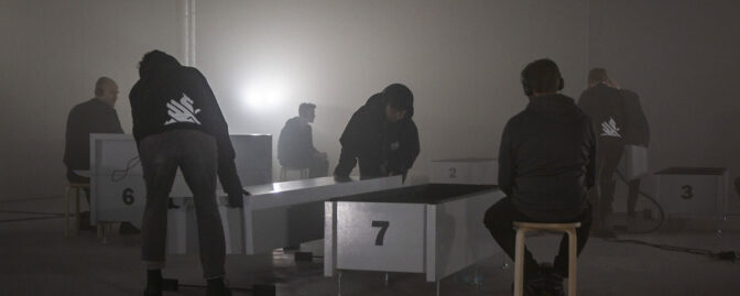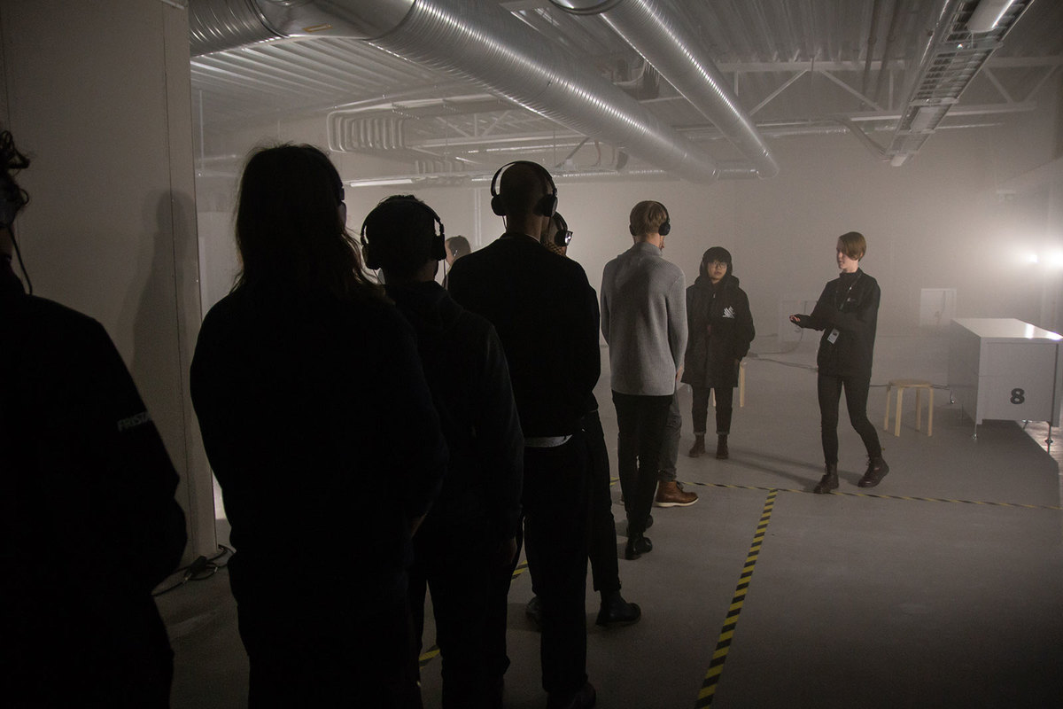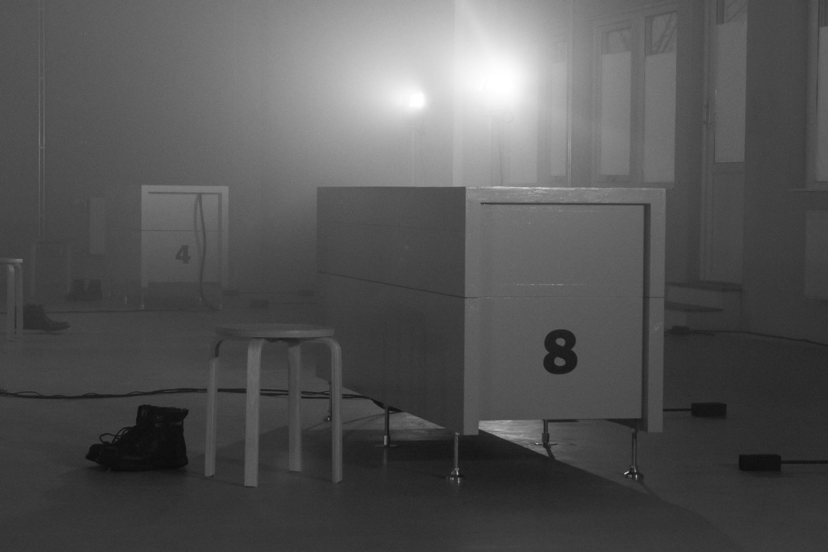 Vi rundar ett hörn när rösten meddelar oss om att vi nått vår destination. Den ber oss hänga av oss våra jackor, leder oss in i en hiss, igenom tunga metalldörrar in i en stor ljus lagerlokal med betongväggar där svartklädda personer står kring de 8 sarkofagerna som byggs speciellt för detta tillfället. Känslan av att gått in en mardröm är slående. Och bara vetskapen att jag frivilligt utan att byta några ord med personerna kring mig, alldeles strax ska kliva in en av en sarkofagerna och bli instängd i några timmar bara för att en röst i ett par hörlurar bett mig, får mig att ifrågasätta mitt eget förnuft.