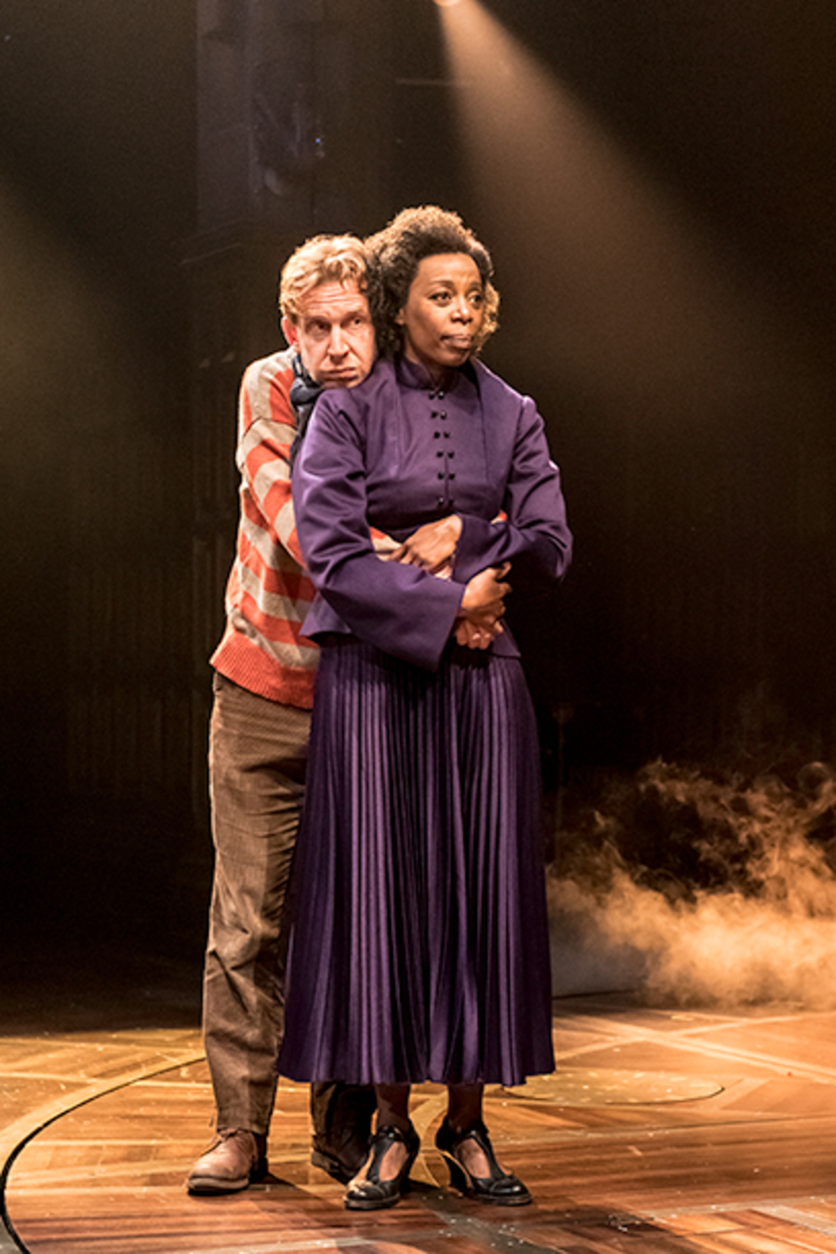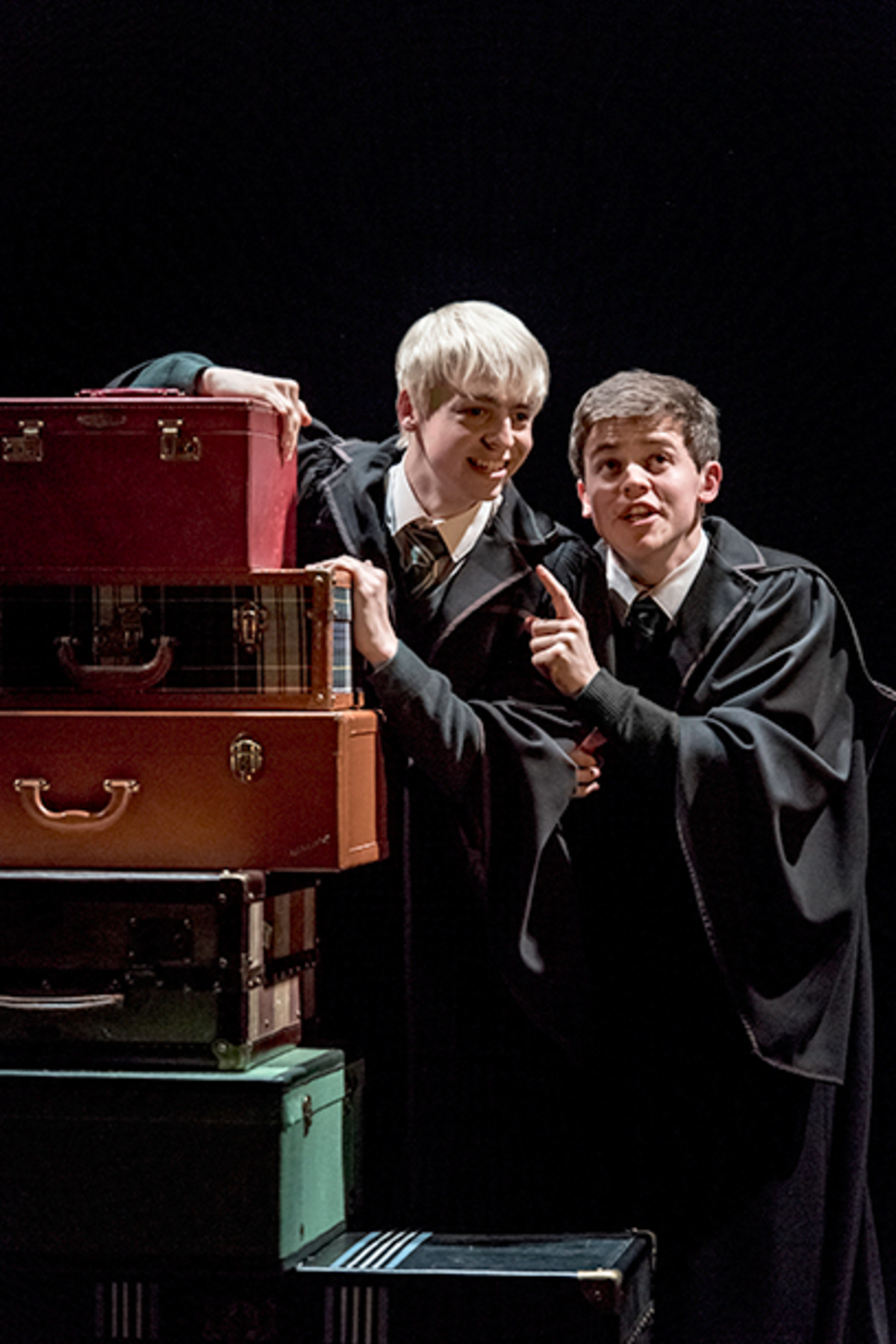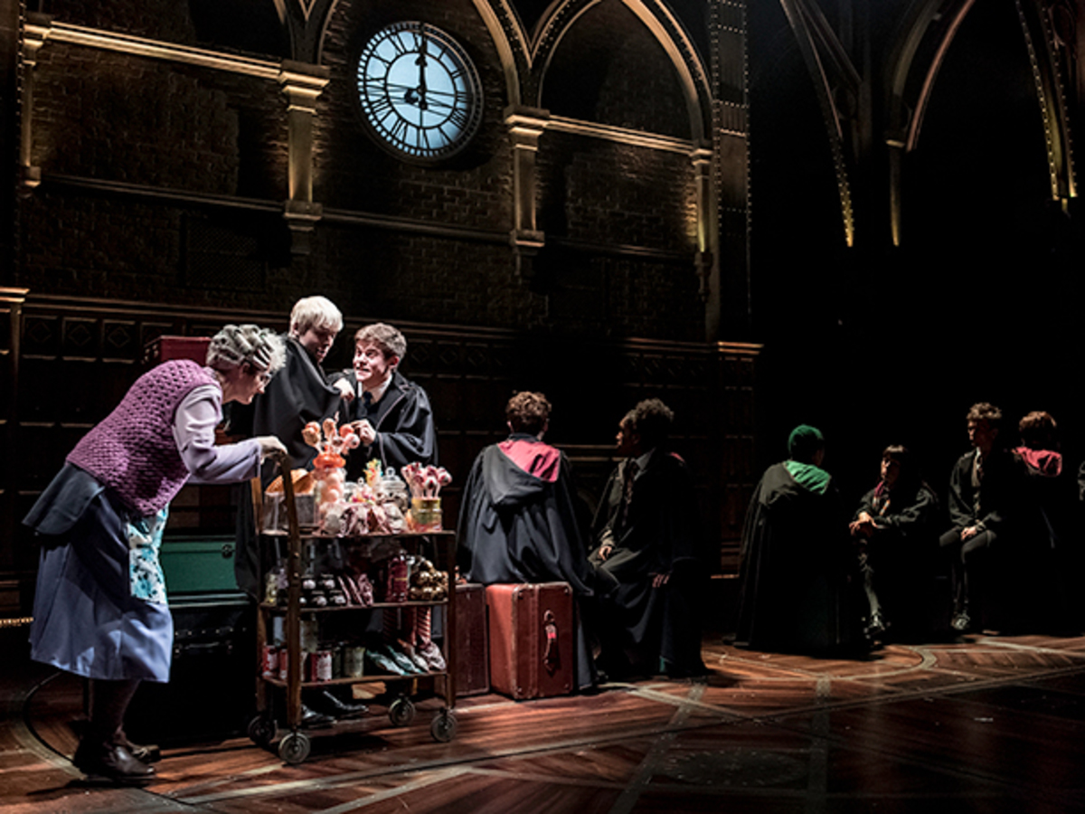 Albus (Sam Clemmett) och Scorpius (Anthony Boyle) är ombord på Hogwartsexpressen, där de serveras av häxan med serveringsvagnen (Sandy McDade).
