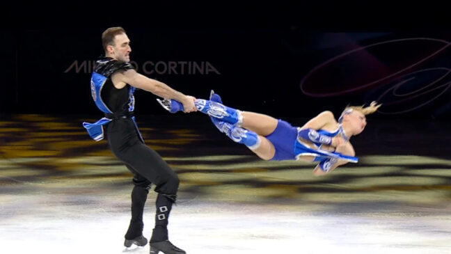 Det är de georgiska konståkarna Anastasiia Metelkina och Luka Berulava som under en uppvisning där publiken bedömer idrottarna kommer ut i ikoniska dräkter från spelen.