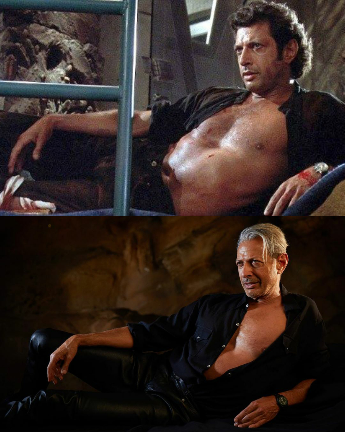Goldblum, som återvänder i rollen som Dr. Ian Malcolm, har återskapat ett ikoniskt och meme-värdigt ögonblick från originalfilmen. 27 år efter Steven Spielbergs ”Jurassic Park” ser vi att Dr. Malcolm fortfarande gillar sina uppknäppta skjortor.