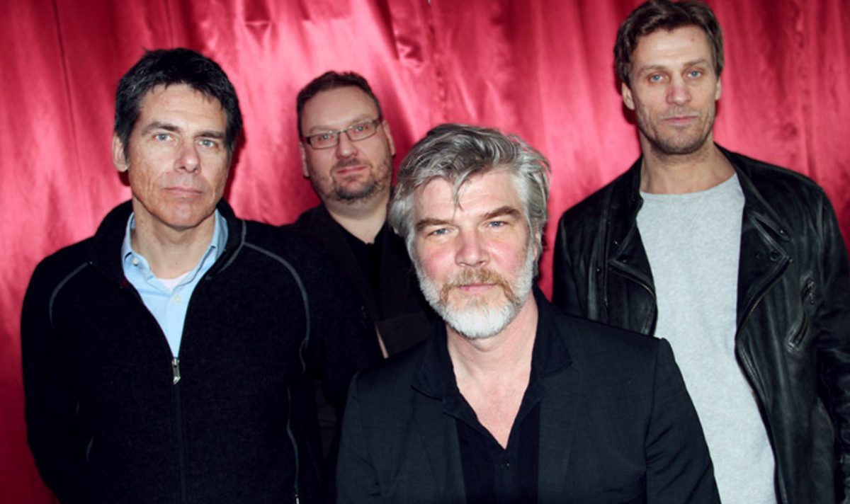 Anders Nilsson med skådespelarna från Johan Falk-serien: Jakob Eklund, Jens Hultén och Mikael Tornving. Foto: MovieZine