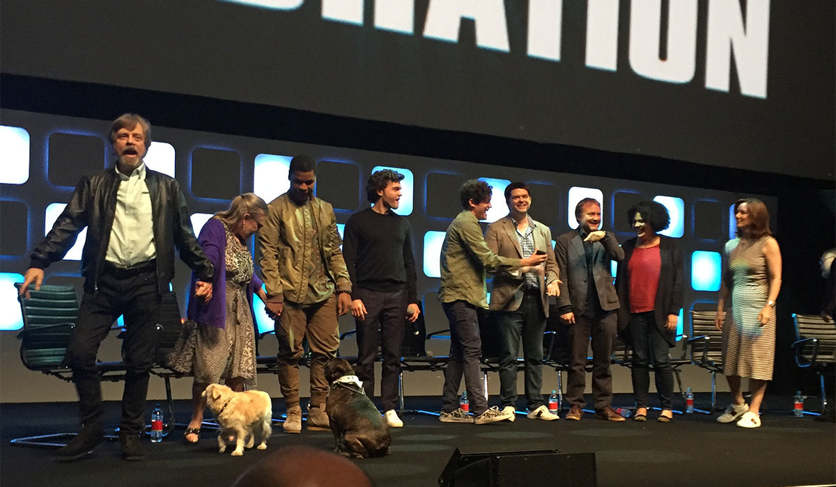 Fr.v: Mark Hamill, Carrie Fisher, John Boyega, Alden Ehrenreich, Phil Lord, Chris Miller, Rian Johnson, Kiri Hart, och Kathleen Kennedy.