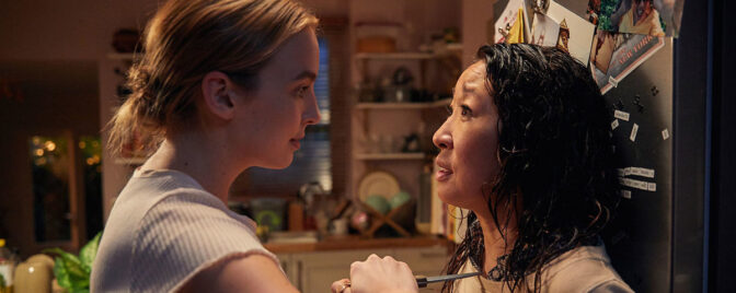 När vi först möter Eve, MI5-arbetare i 40-årsåldern (spelad av Sandra Oh), lider hon av baksmälla. Hon ser sliten ut så vi kan anta att hon, likt karaktärerna i Alfredsons film eller John Le Carrés roman, inte lever något trevligt familjeliv med villa och vovve.