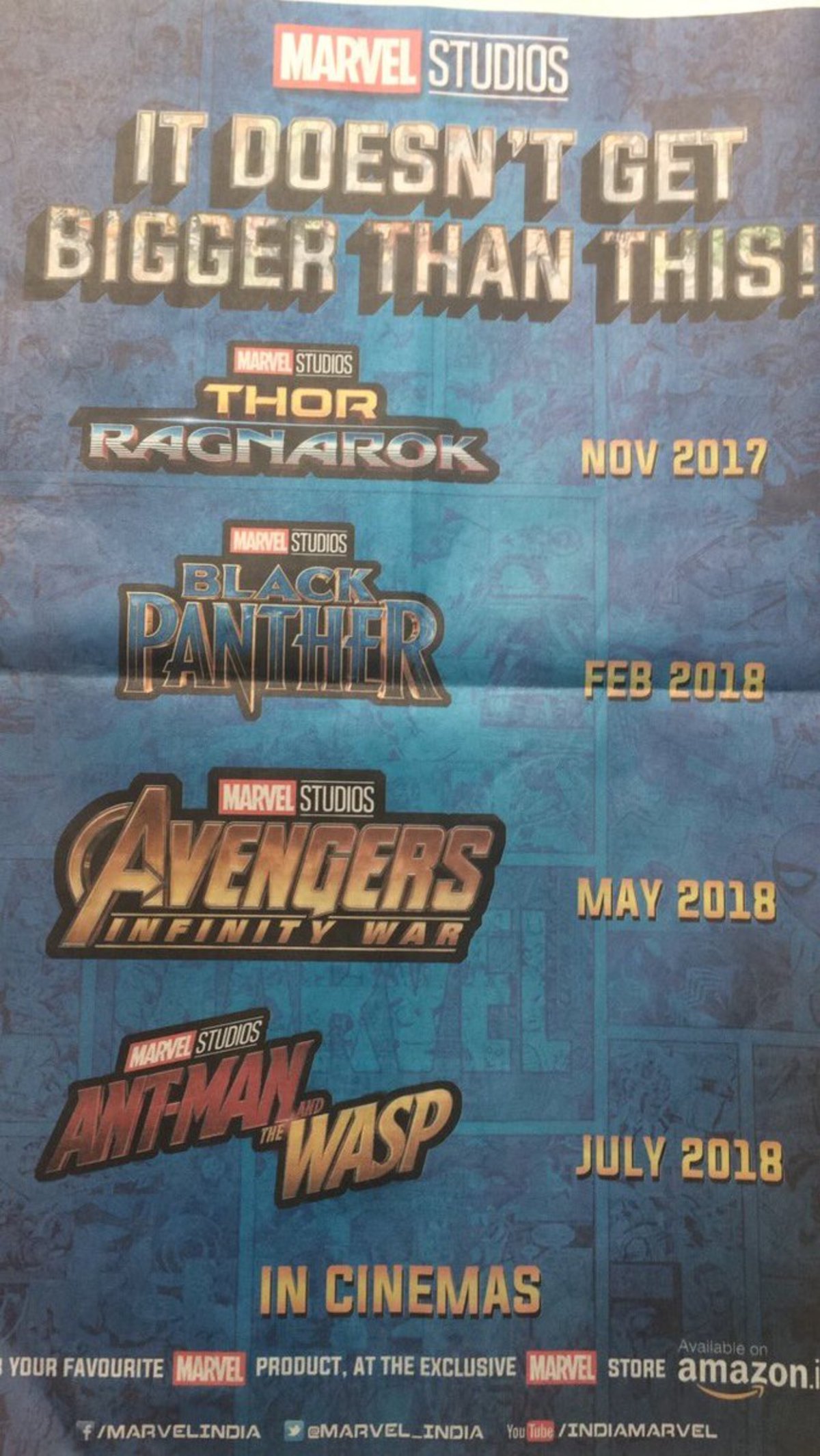 Marvel slår på stora trumman inför sina fyra kommande biopremiärer. I annonser som hittats i Bangalore Times lovar de sina indiska fans ”de största filmerna hittills”.