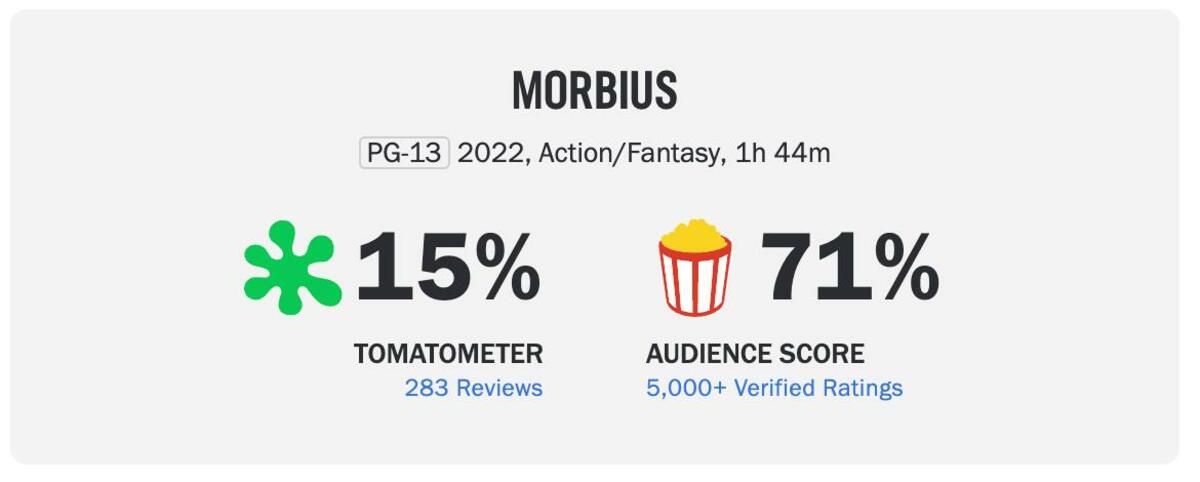 Däremot verkar publiken inte helt överens med kritikerna om att ”Morbius” suger. På betygssajten Rotten Tomatoes gav kritikerna 15% positiva omdömen medan publikens motsvarande betyg är höga 71%.