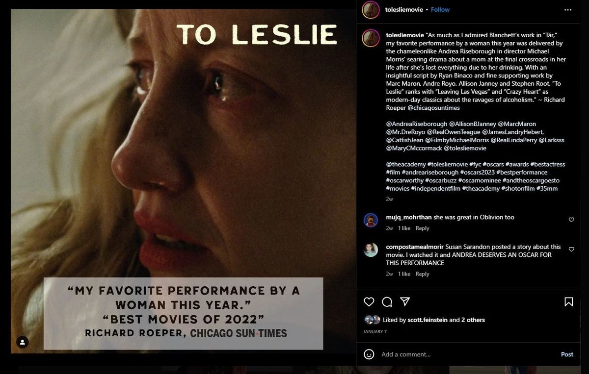 Ett exempel är detta (nu raderade) Instagram-inlägg där filmens officiella sida citerar en recension: ”Hur mycket jag än älskade Cate Blanchett i Tár så stod kameleonlika Andrea Riseborough för min favoritprestation i år”. (Att nämna konkurrerande nomineringar som en del av sin kampanj är strikt förbjudet.)