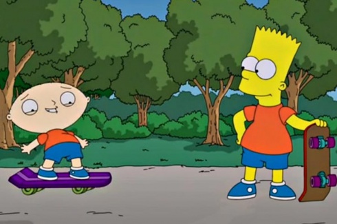 Fox avslöjade på måndagen under sina årliga upfronts – där höstens program visas för marknaden – att de två animerade familjerna kommer mötas i ett timmeslångt avsnitt i september i USA. I ett kort klipp, som tyvärr ännu inte nått nätet fick publiken se Bart Simpson och Stewie Griffin åka skateboard i Springfield och deras respektive pappor Homer och Peter slåss på öppen gata.