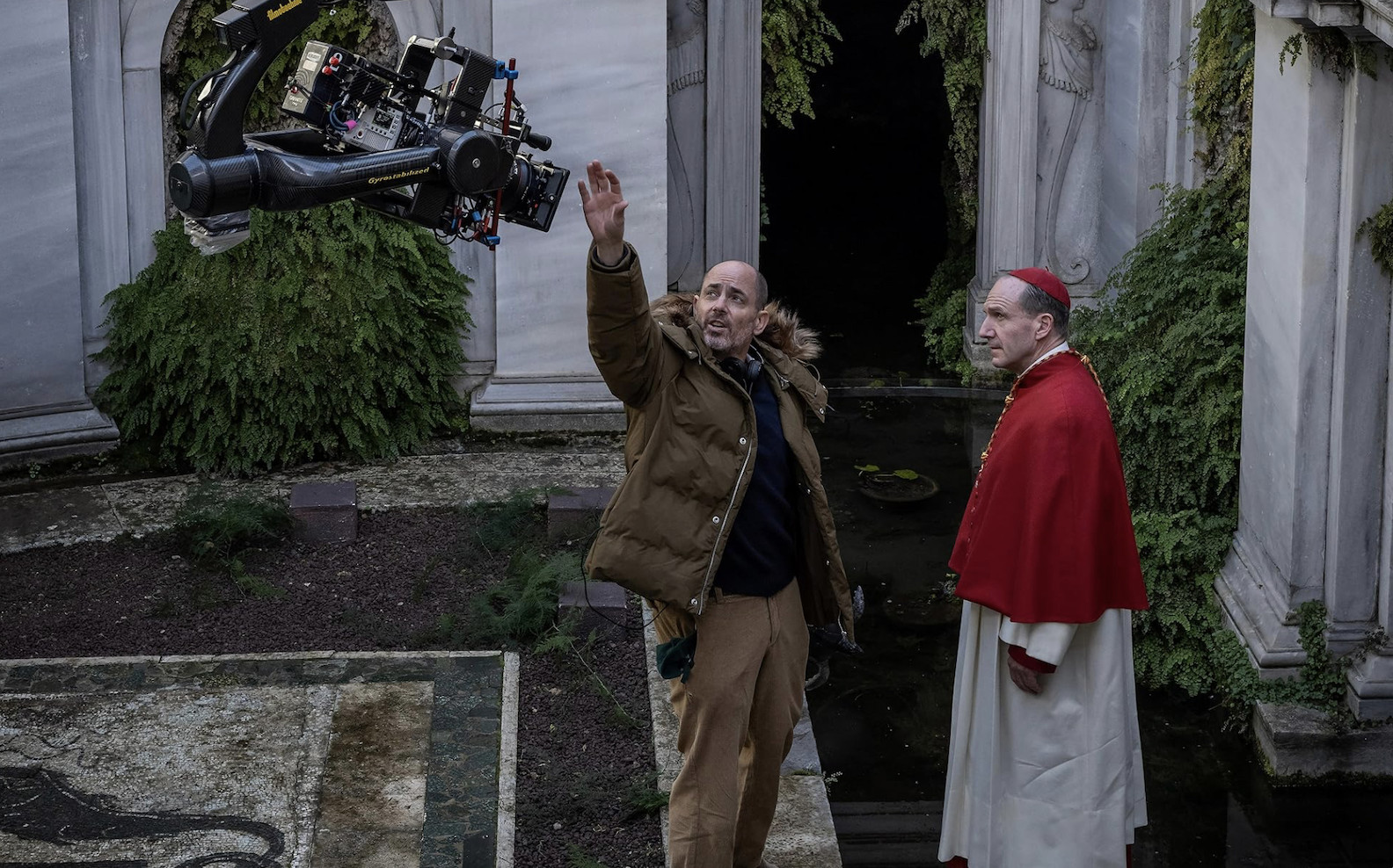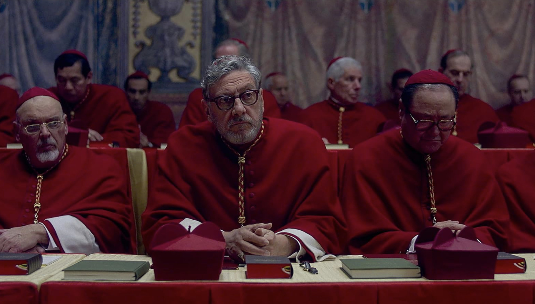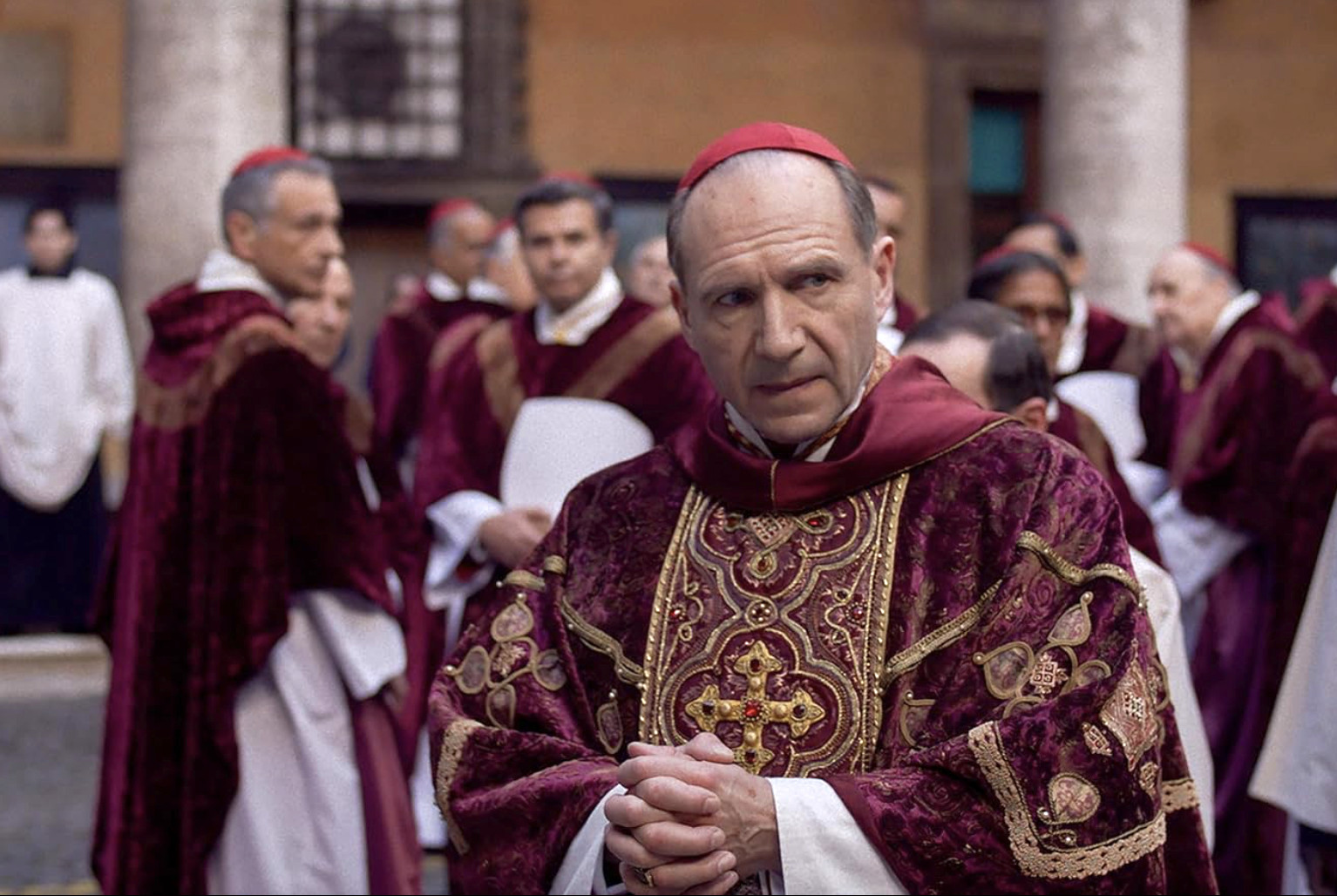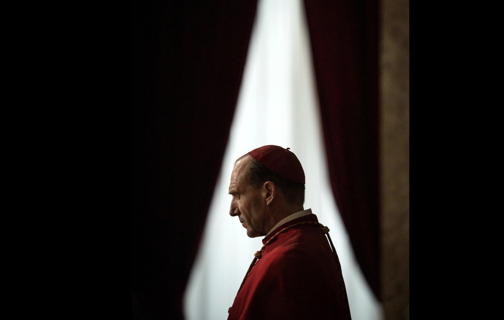 Fiennes: Scenen som verkade kräva den mest detaljerade koreografin är den första röstningsscenen, som jag vet var viktig för Edward. En scen vissa regissörer skulle kunna vara för otåliga för, men jag tror att Edward verkligen ville att publiken skulle förstå att så här fungerar ritualen, och det här är den tid det tar. En kardinal går upp och lägger röstkortet i den stora urnan, som sedan träs på snöret med nålen.