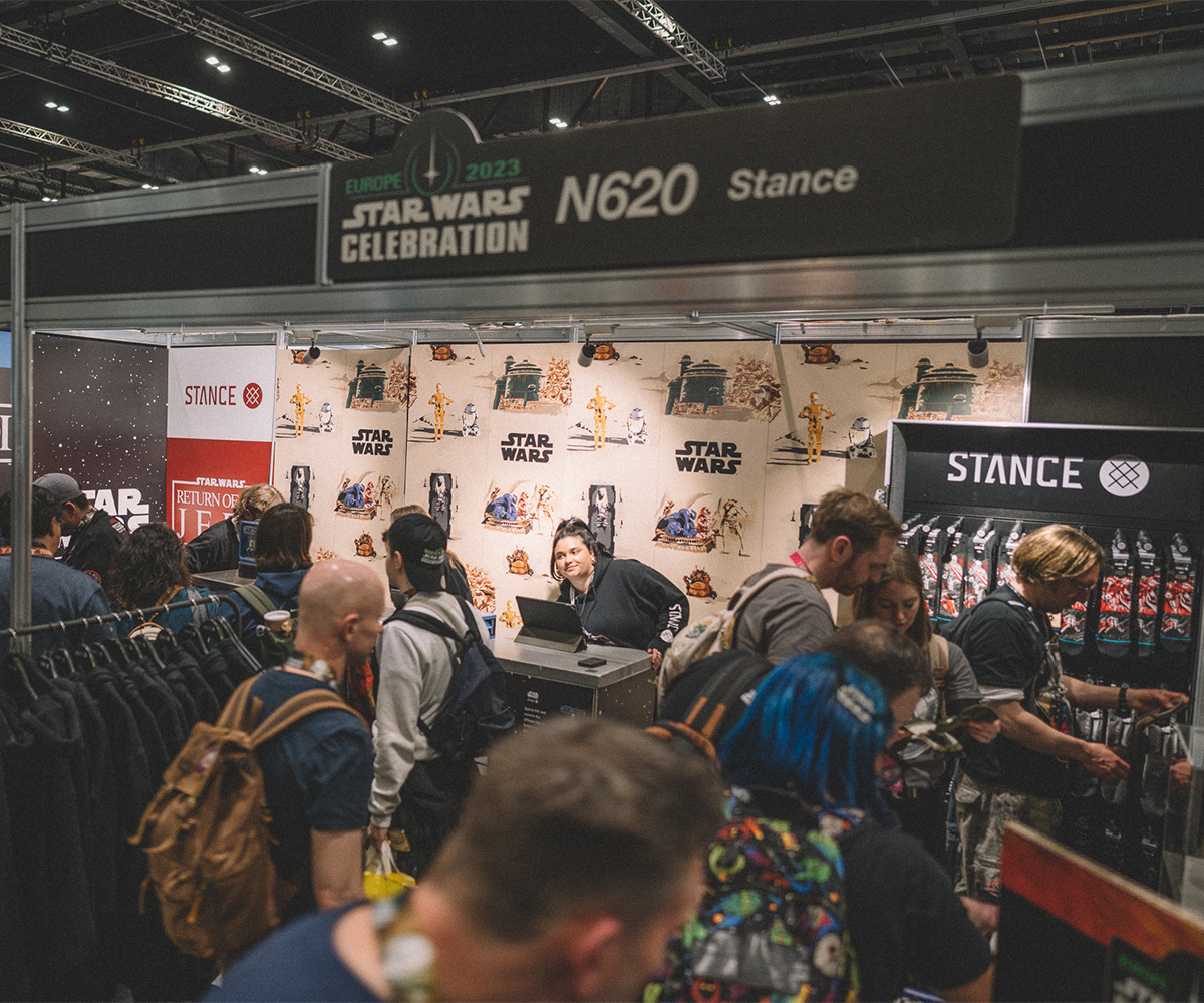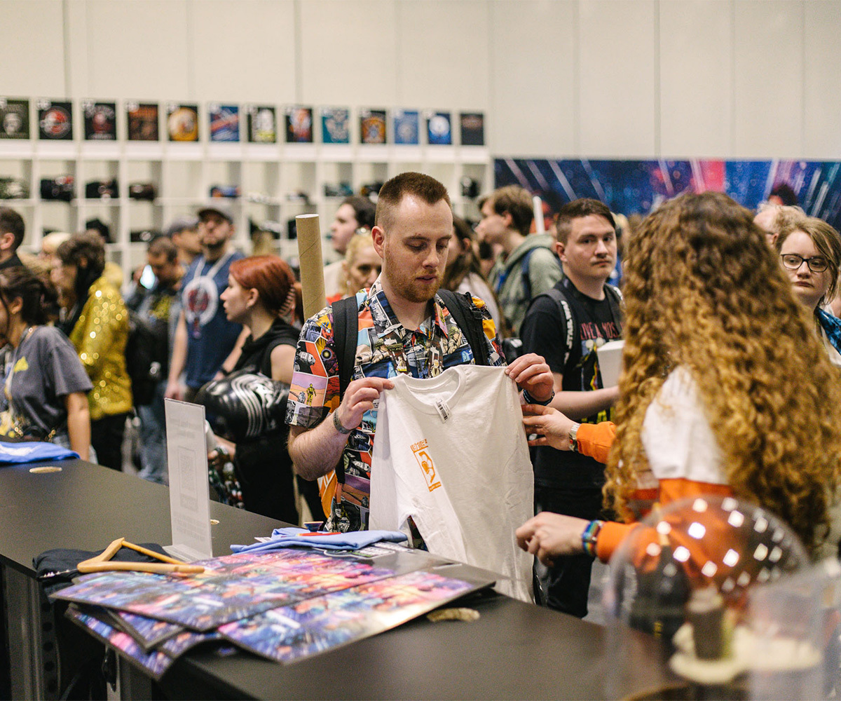 I en gigantiskt stor lokal finns allt, bokstavligt talat, allt, som en Star Wars-fan kan önska sig och är beredd att betala dyrt för. T-shirts, böcker, foton, kläder, lasersvärd, hjälmar, allt finns. En Stormtrooper-hjälm (i plast) kostar 400 kronor, en lunchlåda med motiv från ”Jedins återkomst” kostar nästan en tusenlapp. En researrangör erbjuder en resa till Tunisien för en fyradagars vistelse där man filmat i öknen med en natt i vad som sägs vara Luke Skywalkers bostad på Tatooine. Kostnad? Nånstans i närheten av 20.000 kronor.