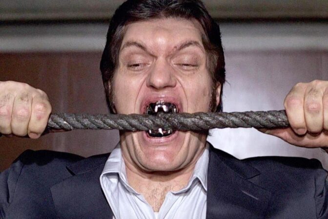 För Richard Kiel kom berömmelsen tack vare enbart en ikonisk roll. Den som henchman i Bondfilmerna – kallad ”Jaws”, på grund av karaktärens tänder som kunde bita igenom allt.
