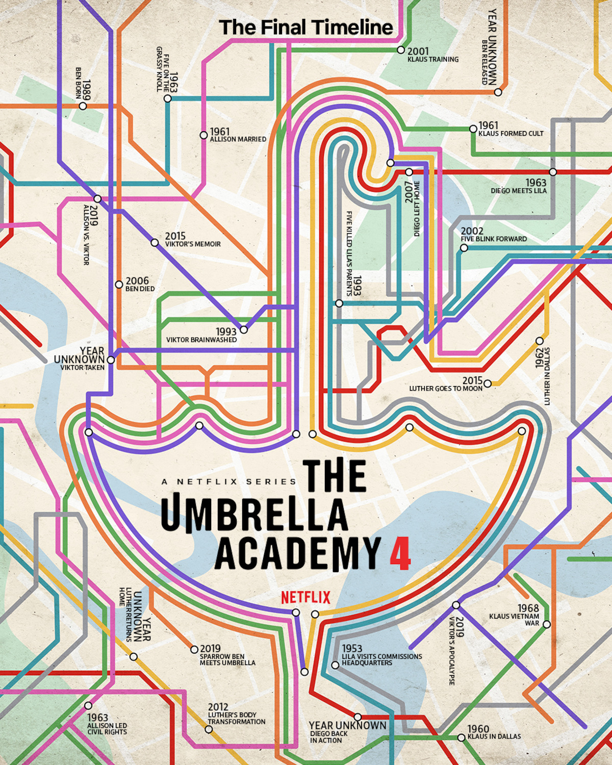 Netflix har idag offentliggjort att “The Umbrella Academy” drar igång sitt sista äventyr den 8 augusti. Säsongen kommer att följa syskonen Hargreeves, den här gången utan sina krafter, i en ny tidslinje skapad av patriarken Reginald. Netflix har släppt en poster som visar upp “the final timeline”: