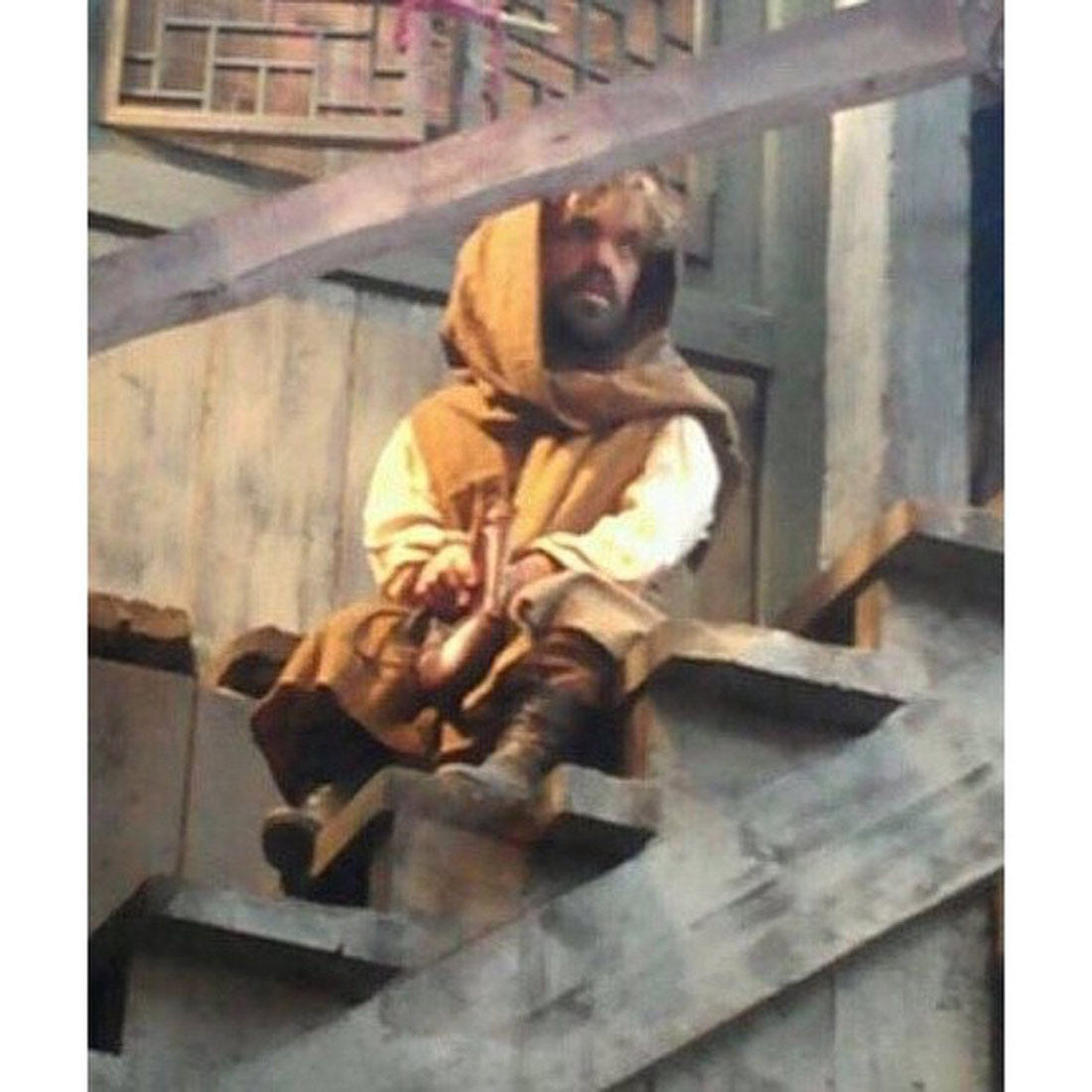 Suddig bild på Tyrion (Peter Dinklage) i någon sorts förklädnad. På flykt efter fadersmordet och Shae-sveket.