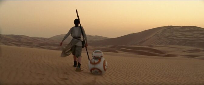 Daisy Ridleys karaktär Rey utforskar ett vrak av vad jag tror är en av rymdimperiets gamla stjärnkryssare på planeten Jakku, till tonerna av ett plinkande piano. Lupita Nyong’os röst ställer henne frågan: ”Who are you?” Svaret blir på klassisk hjältemanér: ”I’m no one.”
