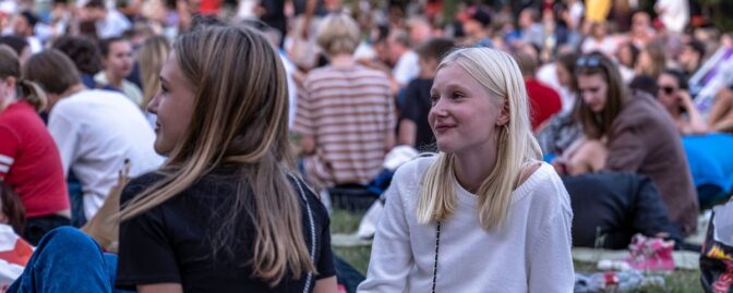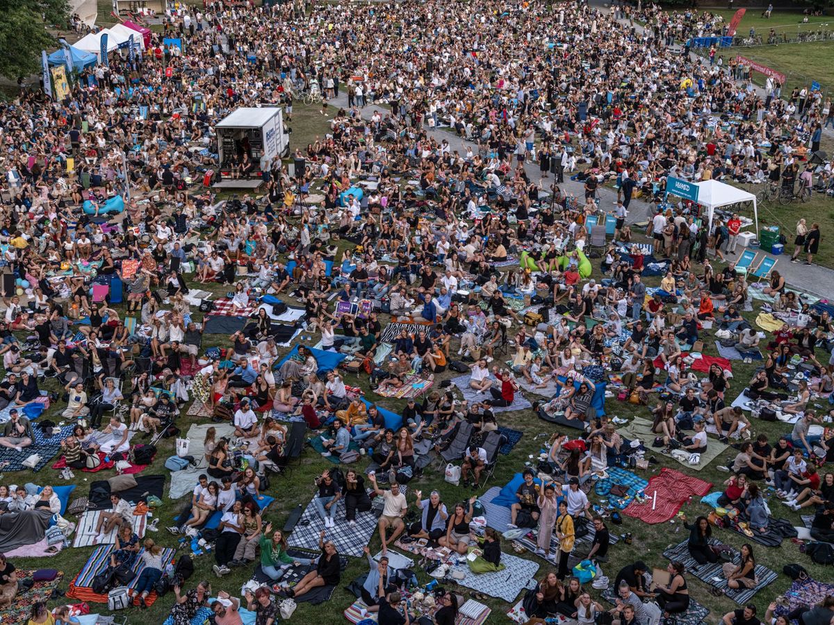Redan vid sextiden hade tusentals personer bänkat sig i gräset framför den stora vita bioduken med picknickfiltar och campingstolar.