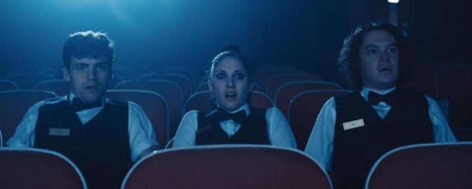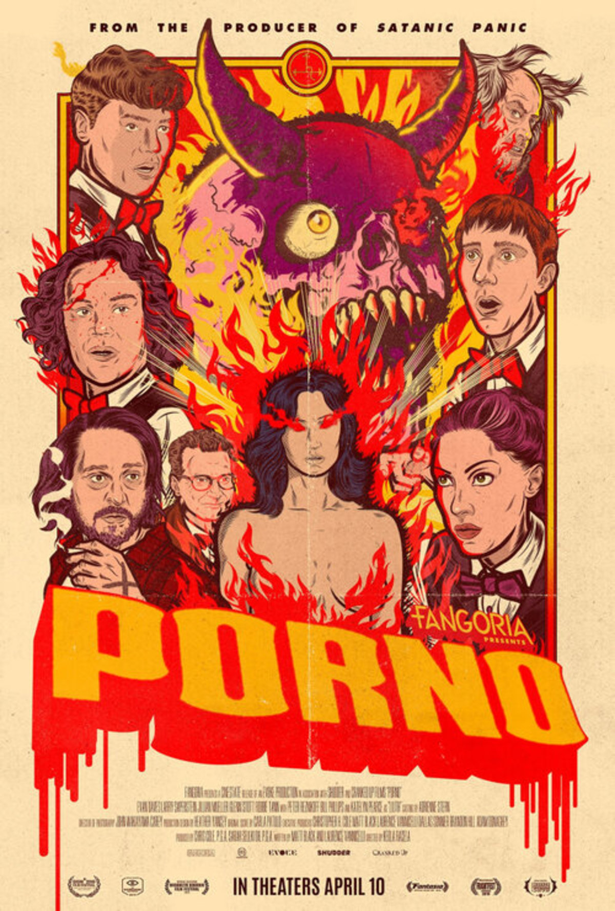 ”Porno” utspelar sig bland fem unga anställda på en porrbio, som lyckas släppa lös en sexdemon ur en film. Jobbigt läge, som verkar öppna upp för både tokigheter och en del äkta skräck – enligt kritikernas citat i trailern.