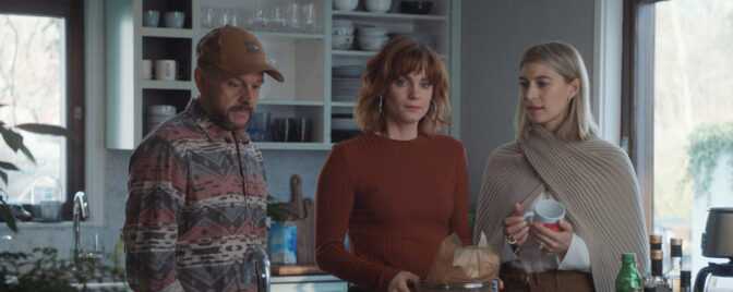 Liv Mjönes, Sven Melander och Katarina Ewerlöf trängs i nya komediserien ”Fullt hus” med premiär i augusti.
