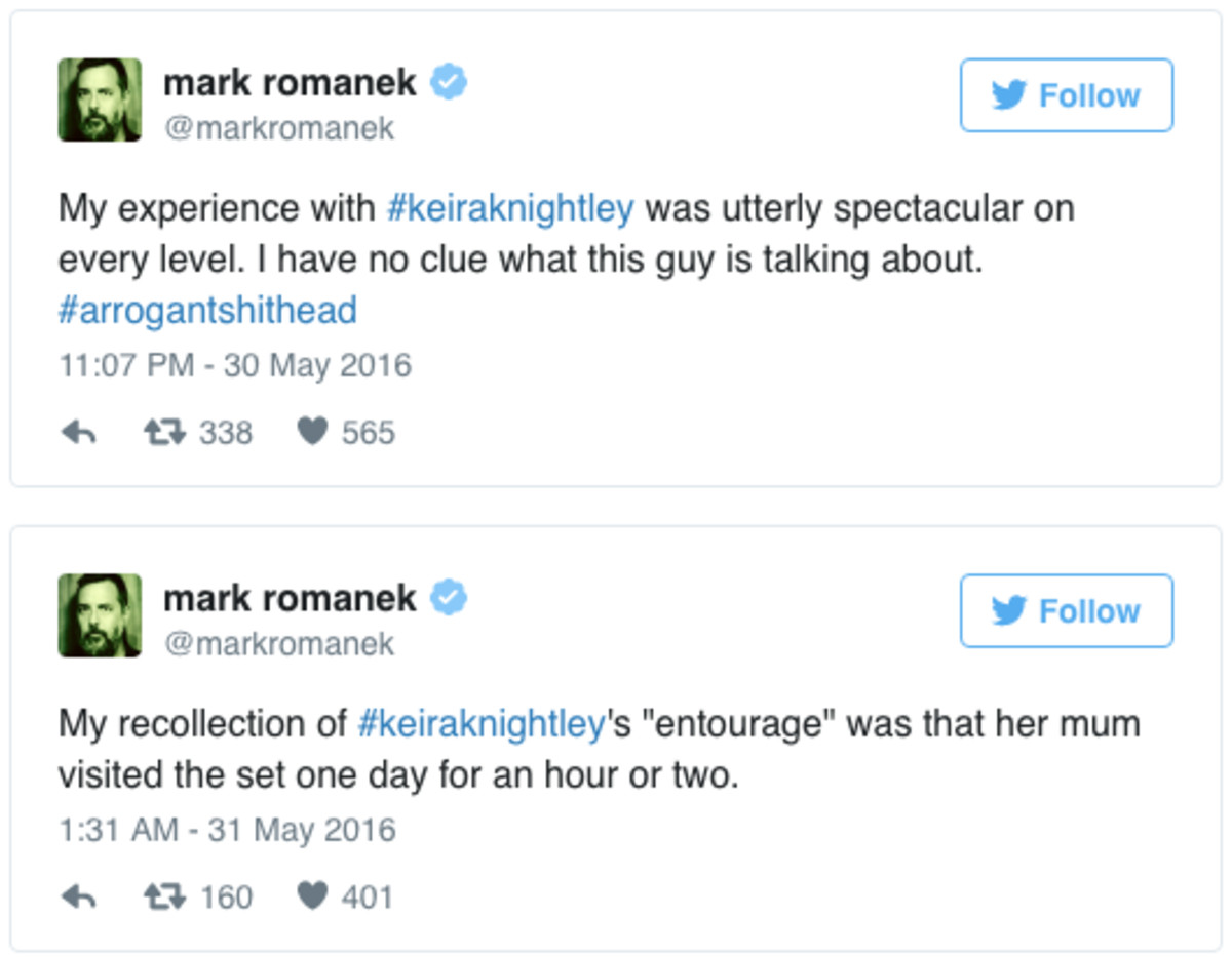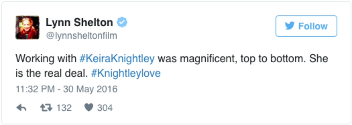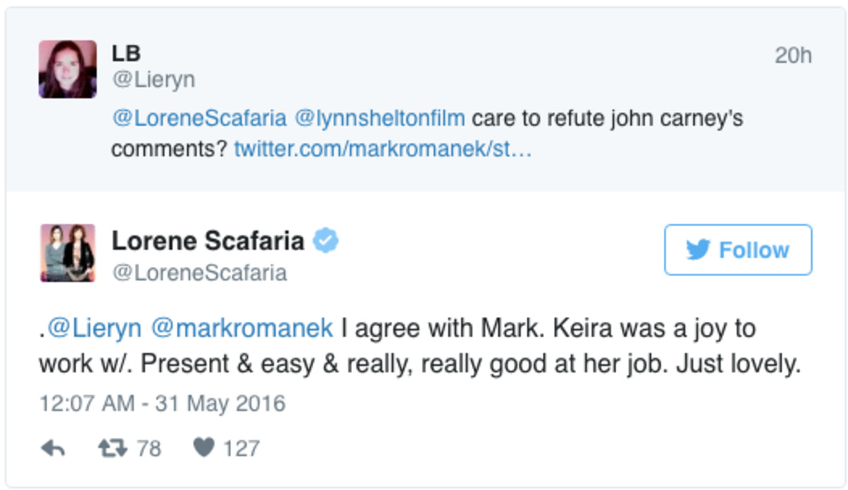 Nu är den här, för de tre respekterade regissörerna Mark Romanek (”Never Let Me Go”), Lorene Scafaria (”Seeking a Friend for the End of the World”) och Lynn Shelton (”Laggies”) har gett sig ut på Twitter i Knightleys försvar. Alla tre beskriver hur de tyckte det var fantastiskt att jobba med Keira och Romanek kallar till och med Carney för en ”arrogant shithead”.