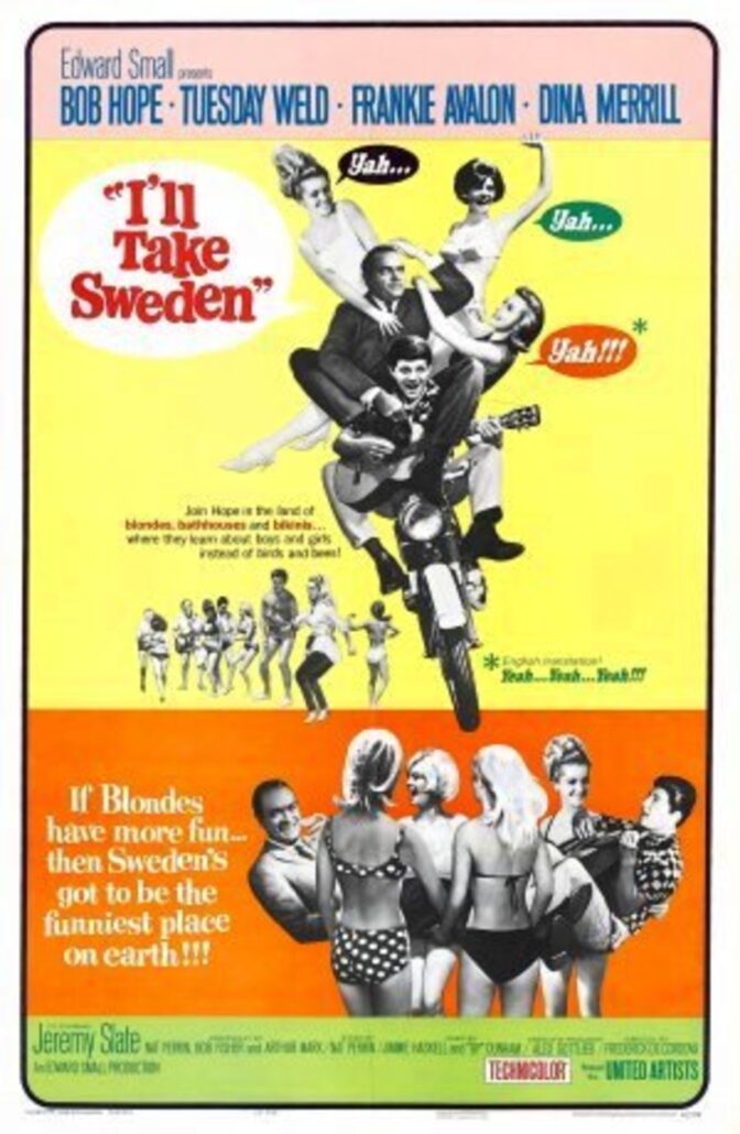 Men nu får vi nöja oss med legendariske komikern Bob Hope i en springa-i-dörrar-i-fars som utspelas i Stockholm och Dalarna (vilket ser misstänksamt ut som Kalifornien…). Sverige hade ju börjat få ett rykte om sig som sexuellt frigjorda – ur jänkarnas perspektiv perverterade och överkåta.