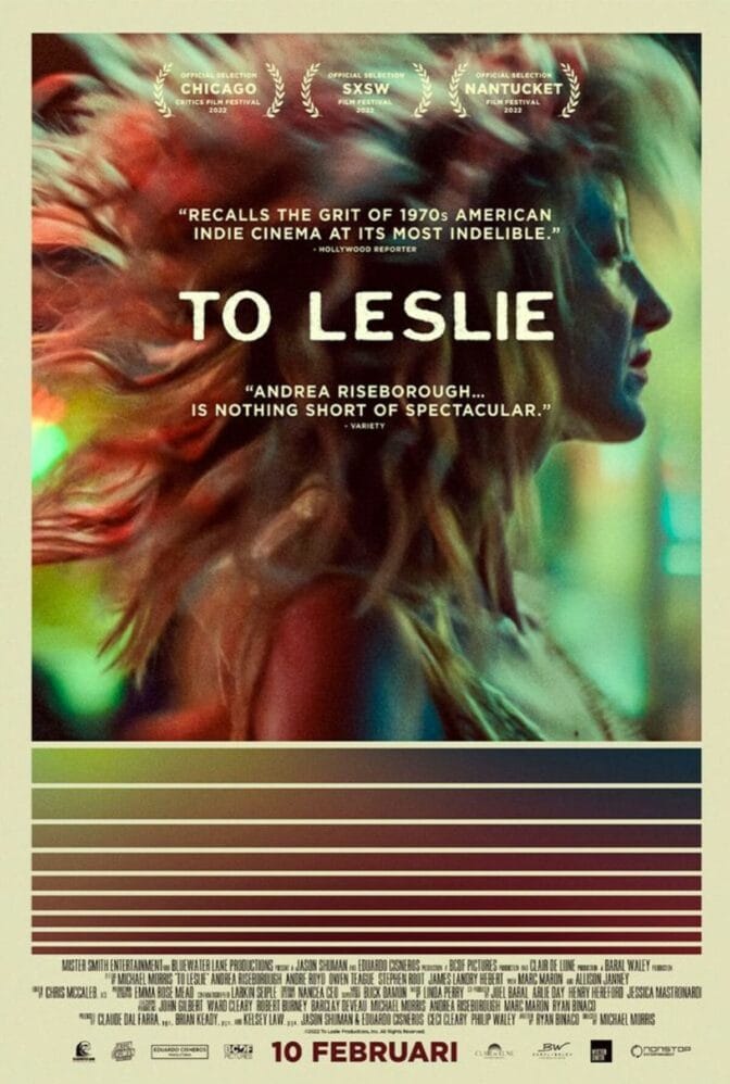 ”To Leslie” är egentligen en rätt konventionell film om alkoholmissbruk och eländet det för med sig. Vi har sett det förr, ofta i starka, sunkiga skildringar, och detta är inget undantag. Det hela handlar alltså om Leslie, en ensamstående mamma på en liten ort i West Texas. Hon vinner jackpot på lotto och blir rik i ett nafs. Fast istället för att ordna till sitt och sonens liv, super hon bort pengarna och blir åter barskrapad.